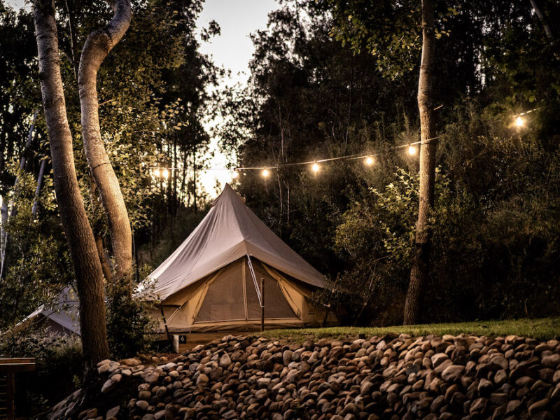 Each glamping tent offers twin beds with Egyptian cotton linen and a duck feather duvet, along with towels, extra blankets, chairs, a coat hook and carpets underfoot. The tent includes a plug point for phone charging.