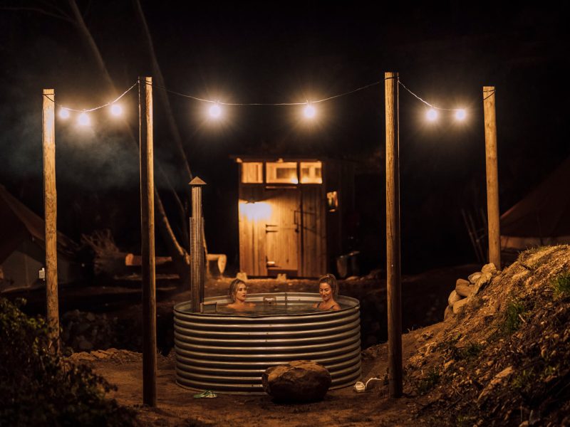The Wild Olive Camp offers 3 Glamping tents, each on their own platform. Guests can unwind in the riverside hot tub, surrounded by the sights and sounds of the outdoors. In the evenings, gather around the cozy fireplace to relax under the stars. With thoughtfully designed tents and a tranquil setting, the Wild Olive Camp blends comfort and adventure for a refreshing getaway in the heart of nature.